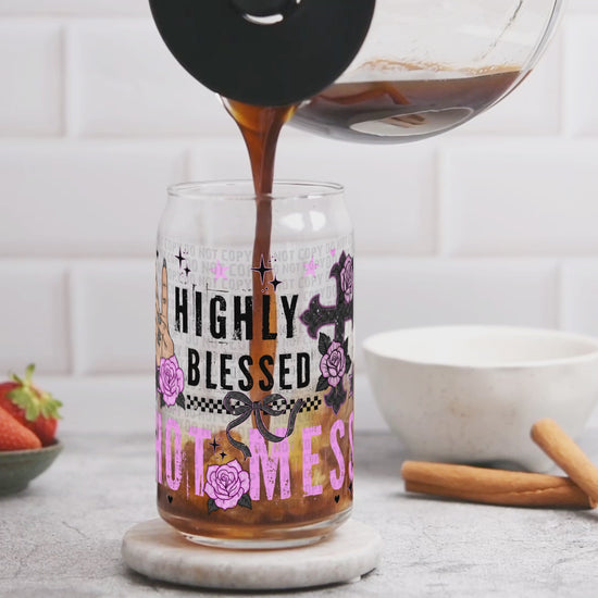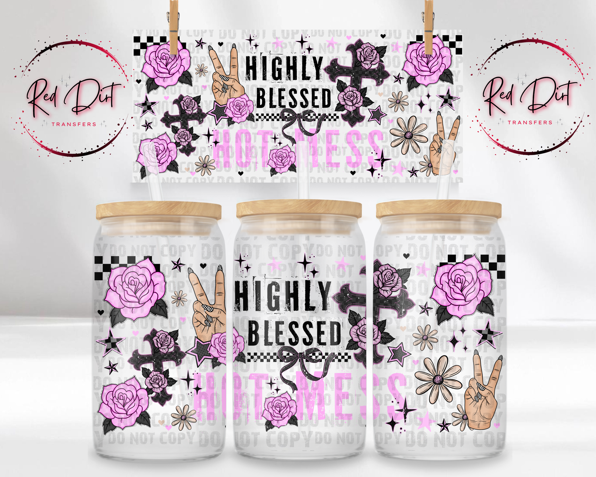 Highly Blessed UV DTF Transfer, Faith Cup Wrap, Christian Glass Can Wrap, Pink Floral Cross Libbey 16 oz Cup Decal