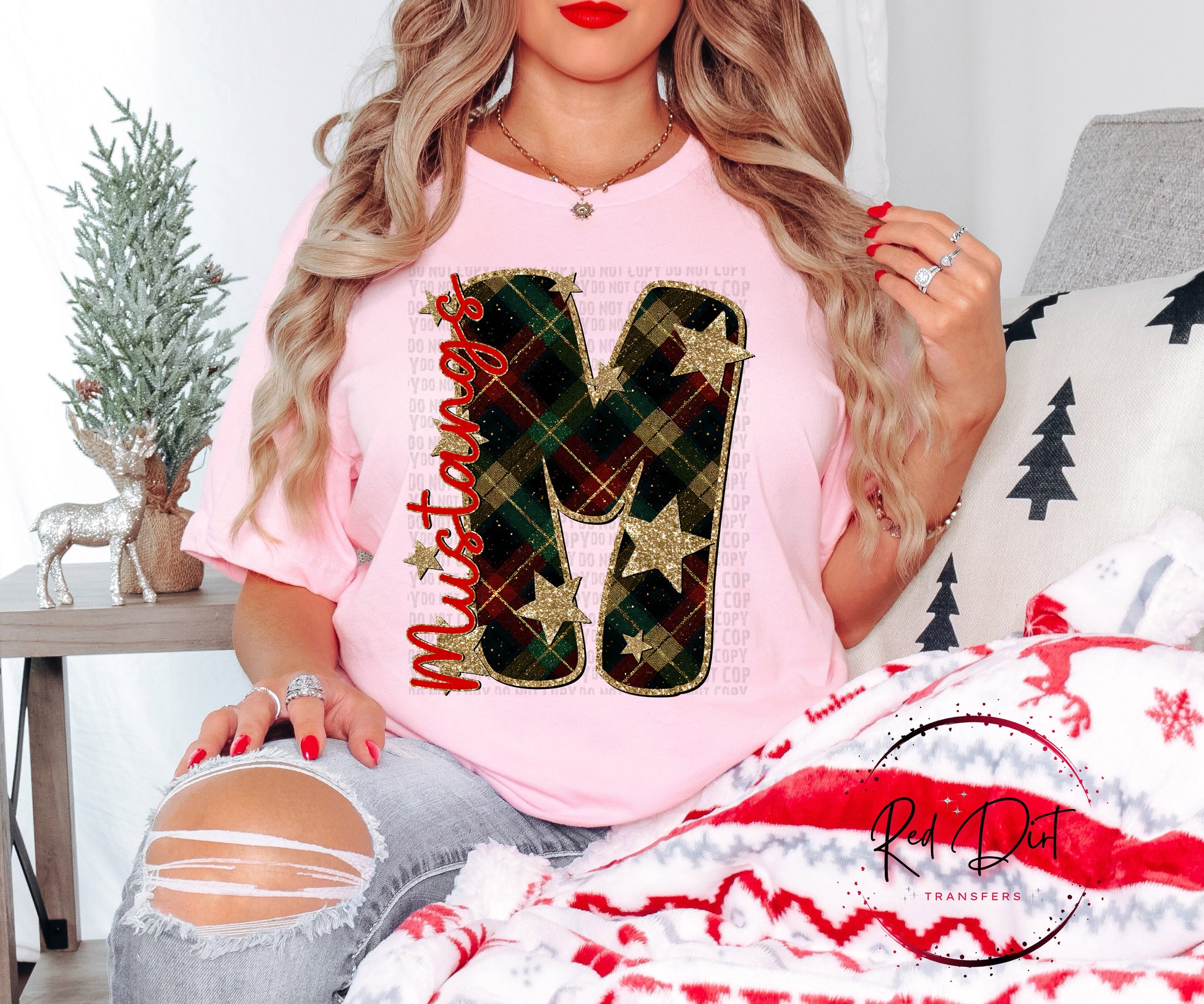 Mustangs Christmas Plaid Mascot T-Shirt | Trendy School Spirit Shirt | Fast Shipping | Super Soft Shirts for Men/Women/Kid's